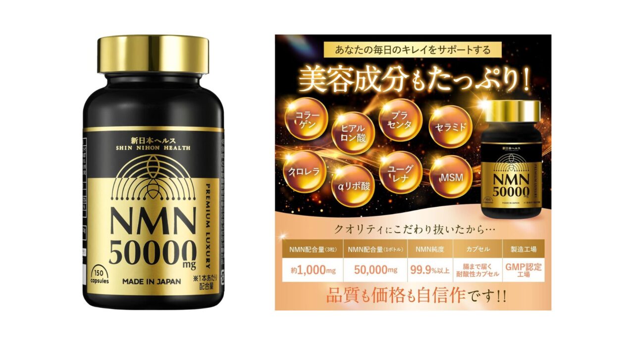 新日本ヘルス NMN 50000mgは、NMNを軸にしつつ、美容成分も一緒に摂取したい人向けの実用型NMNサプリです。